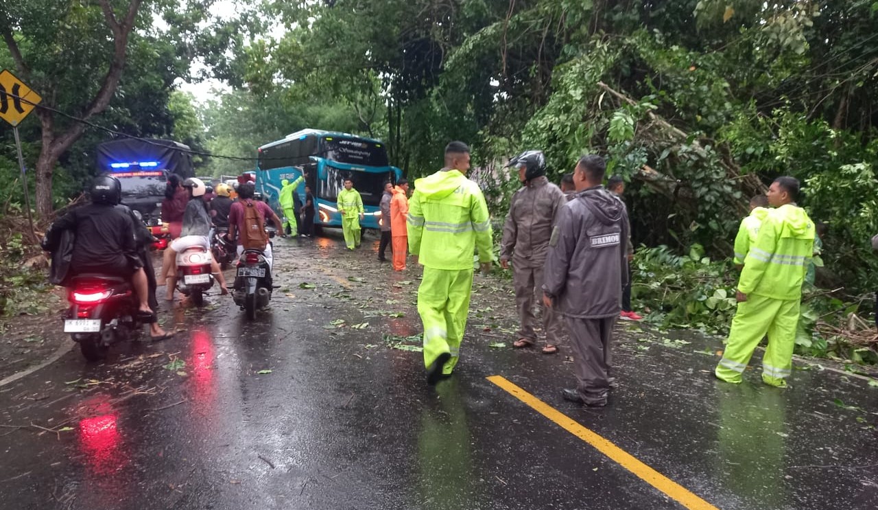 Personel Polsek Melaya kembali bergerak cepat bersama Brimob dan BPBD untuk memotong dan menyingkirkan batang pohon sehingga arus lalu lintas kembali normal.